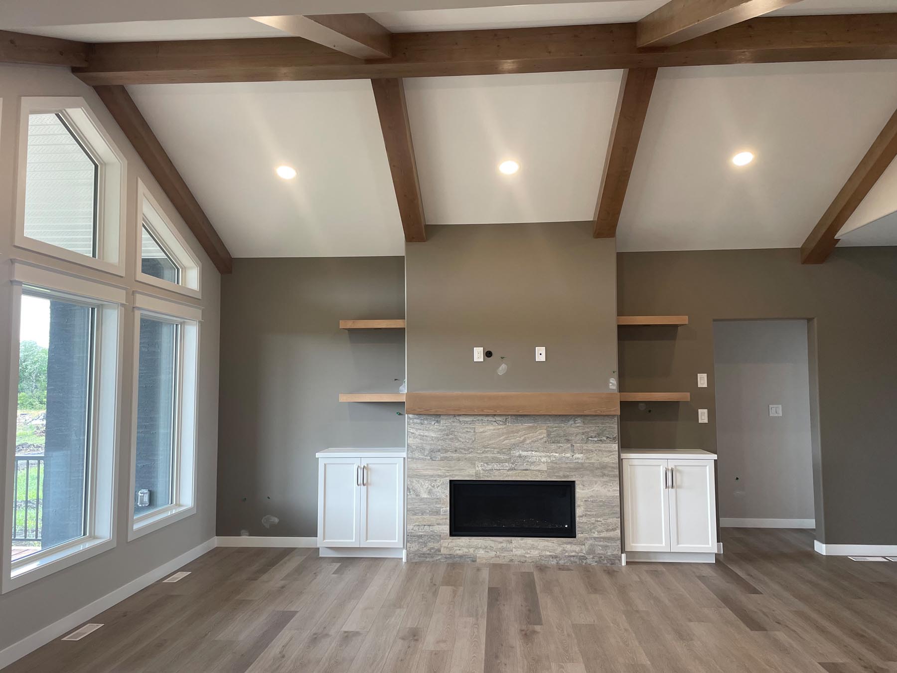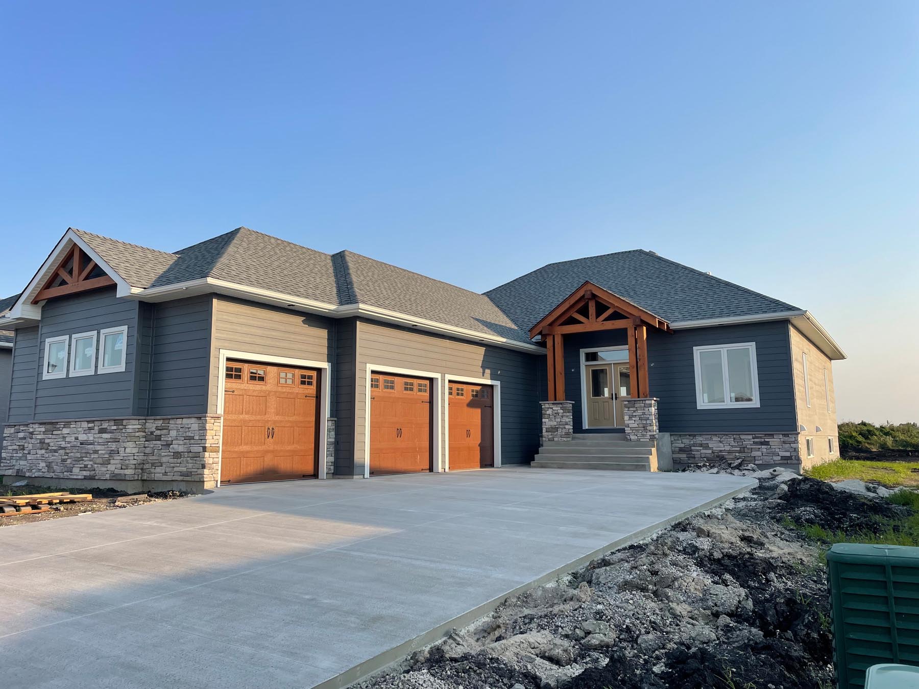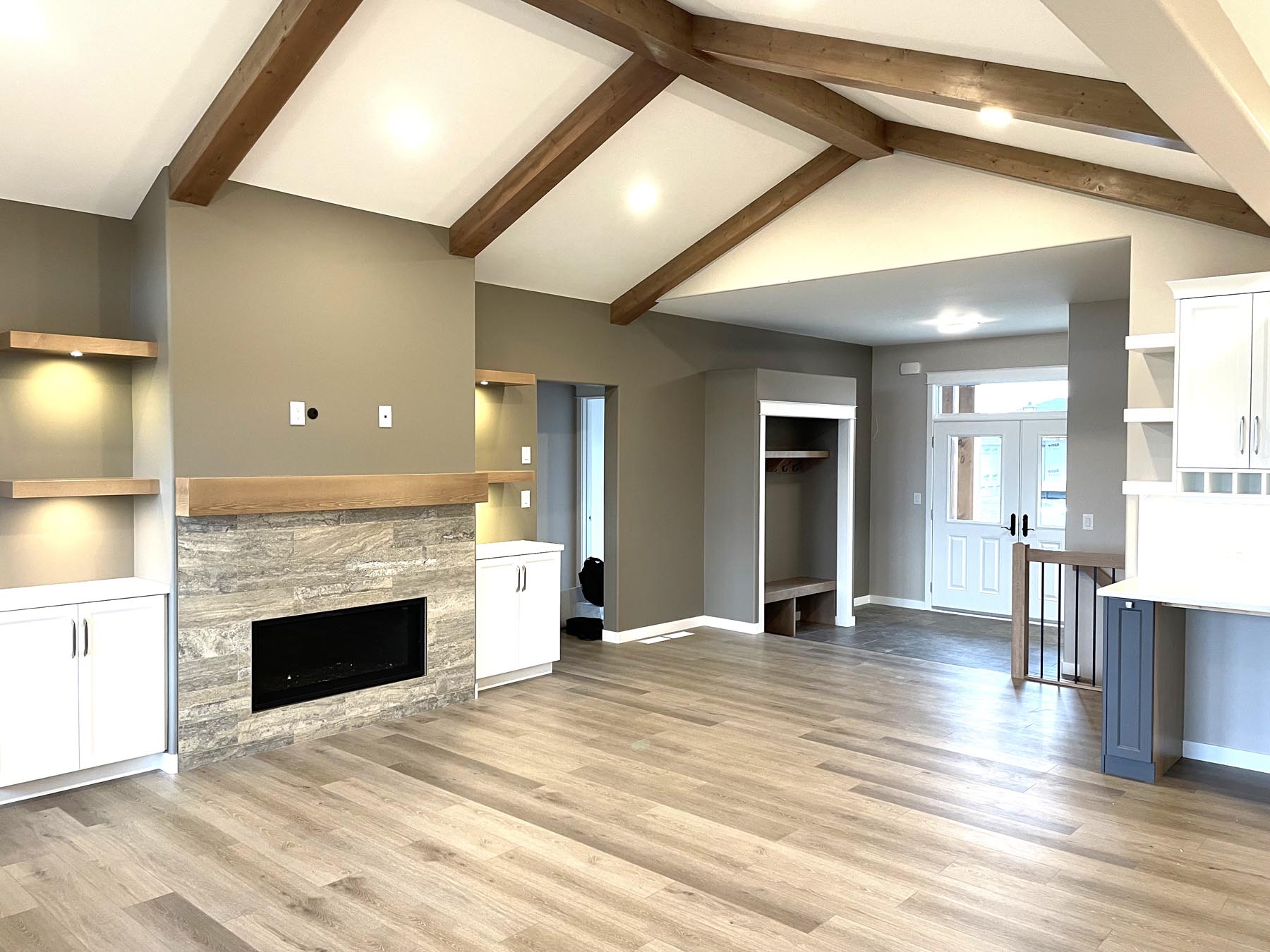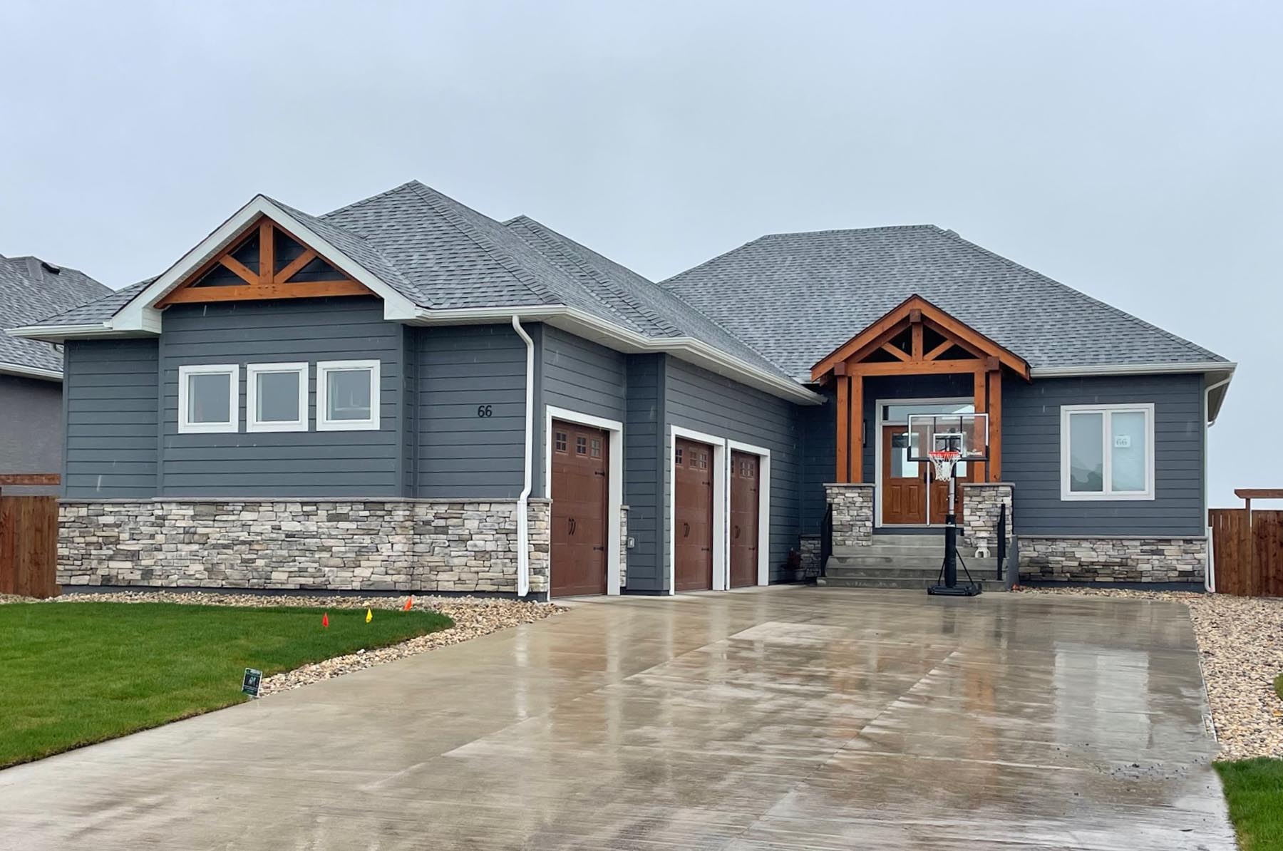 This grand design features exterior and interior beams, a vaulted living room, a sunken entryway and 1841 sq feet of living space. Upon entering through the grand timber-framed front entry, you are welcomed to a large foyer, leading to a beautifully designed great room. High-end finishes throughout provide a warm yet luxurious feel to this design. In addition, the main floor includes three bedrooms (master on one side, other bedrooms on the other side of the home), two bathrooms, and a spacious mudroom with a wall of built-in lockers. The turned triple car garage (26’x38’) has an impressive 1128 sq feet of garage space.