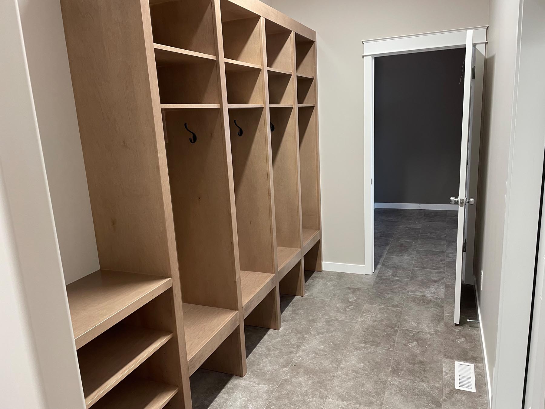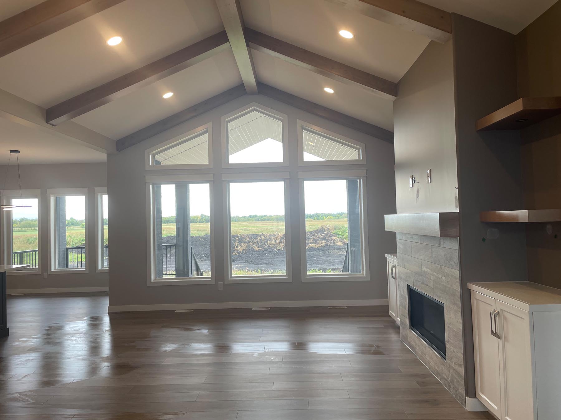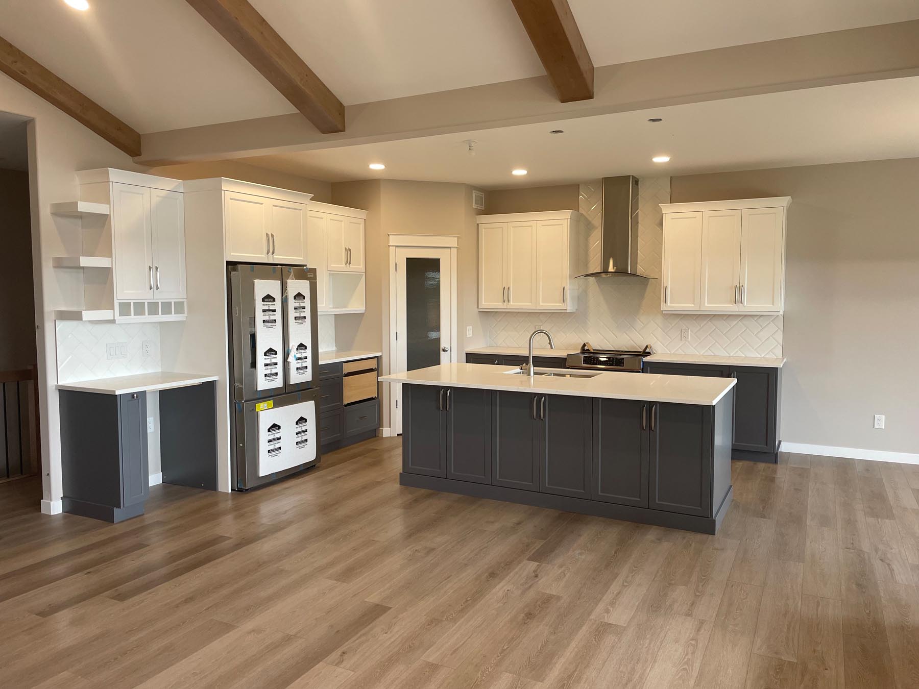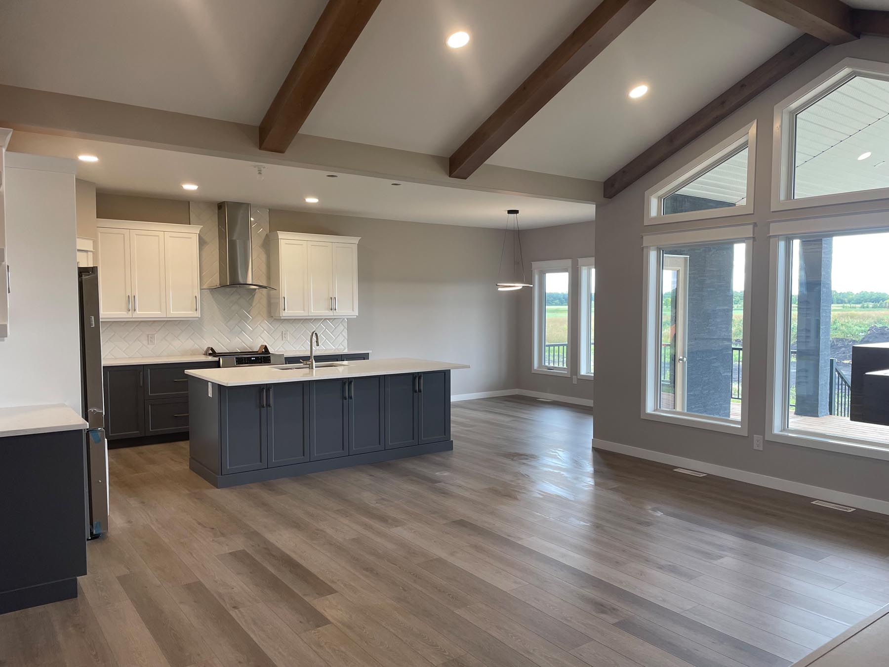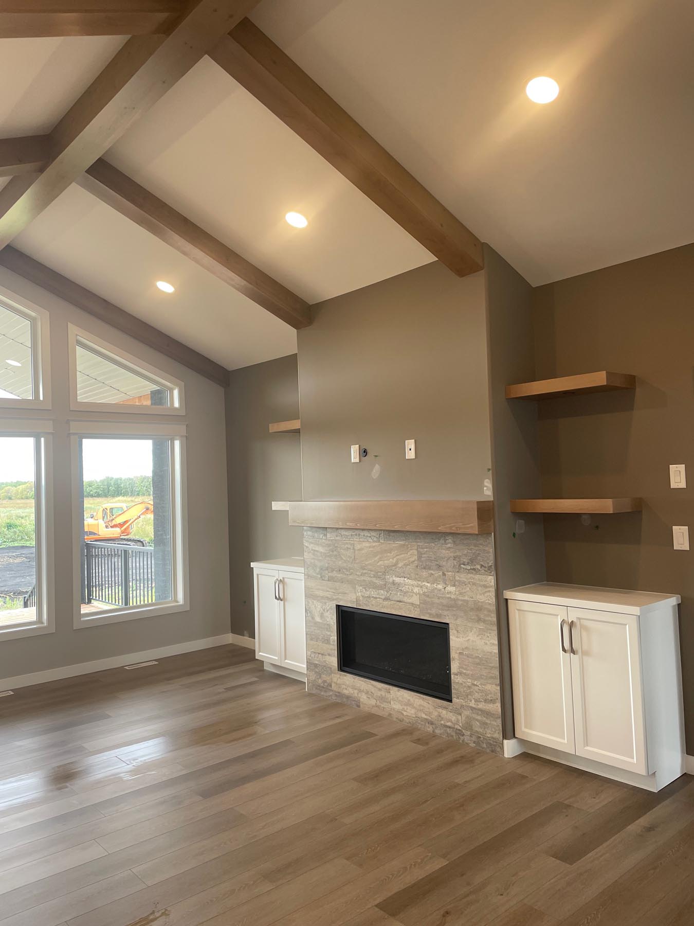 This grand design features exterior and interior beams, a vaulted living room, a sunken entryway and 1841 sq feet of living space. Upon entering through the grand timber-framed front entry, you are welcomed to a large foyer, leading to a beautifully designed great room. High-end finishes throughout provide a warm yet luxurious feel to this design. In addition, the main floor includes three bedrooms (master on one side, other bedrooms on the other side of the home), two bathrooms, and a spacious mudroom with a wall of built-in lockers. The turned triple car garage (26’x38’) has an impressive 1128 sq feet of garage space.